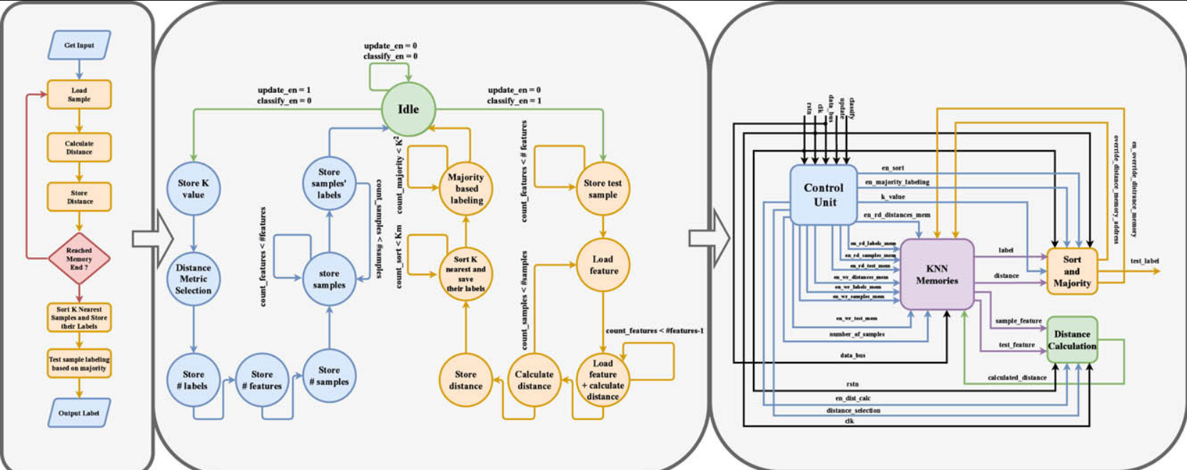 Nowadays, Machine Learning is commonly integrated into most daily life applications in various fields. The K Nearest Neighbor (KNN), which is a robust Machine Learning algorithm, is traditionally used in classification tasks for its simplicity and training-less nature. Hardware accelerators such as FPGAs and ASICs are greatly needed to meet the increased requirements of performance for these