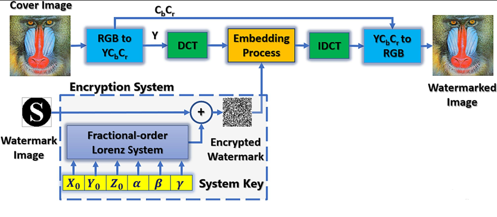 This paper investigates two different blind watermarking systems in the frequency domain with the development of a Pseudo Random Number Generator (PRNG), based on a fractional-order chaotic system, for watermark encryption. The methodology is based on converting the cover image to the YCbCr color domain and applying two different techniques of frequency transforms, Discrete Cosine Transform (DCT)