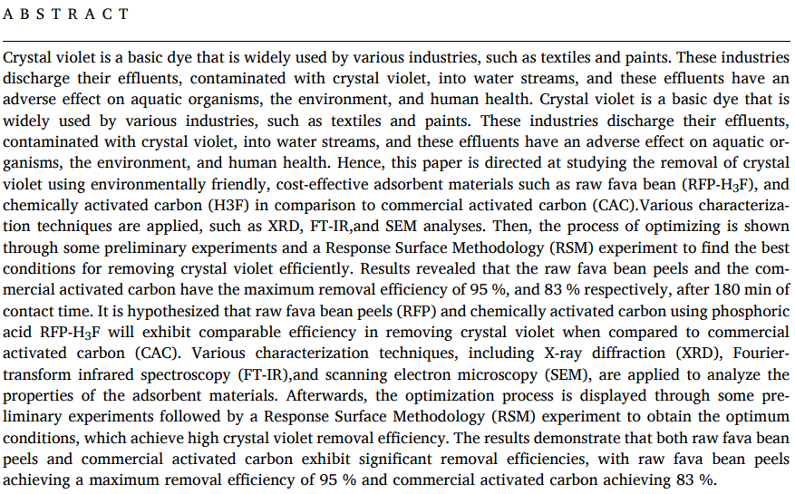 Enhanced removal of crystal violet using rawfava bean peels, its chemically activated carbon compared with commercial activated carbon