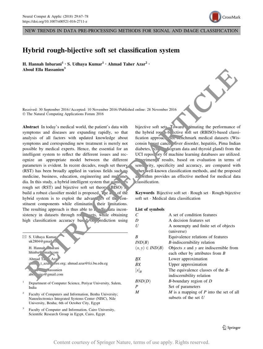 Retraction Note: Hybrid rough-bijective soft set classification system (Neural Computing and Applications, (2018), 29, 8, (67-78), 10.1007/s00521-016-2711-z)