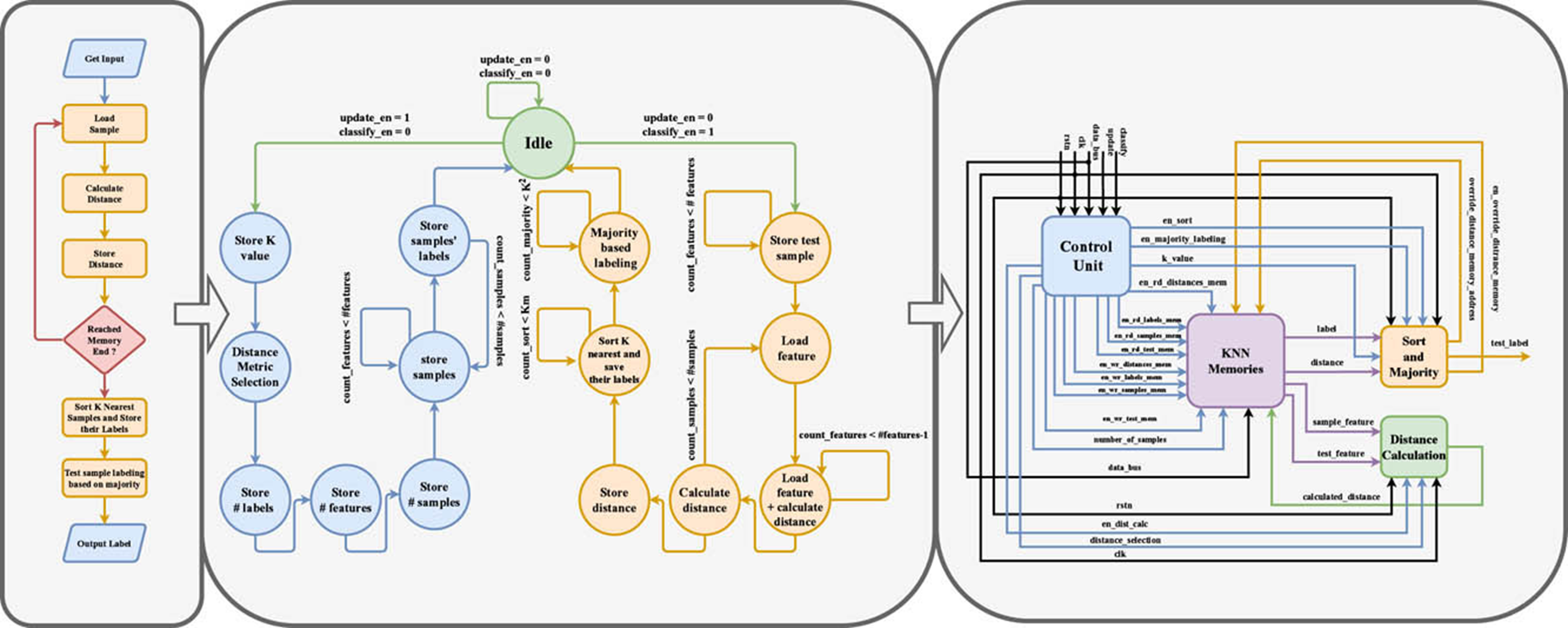 K Nearest Neighbors (KNN) algorithm is a straight-forward yet powerful Machine Learning (ML) tool widely used in classification, clustering, and regression applications. In this work, KNN is applied, with three distance metrics, to classify different datasets, experimentally testing each distance metric effect on the classification performance. A static K is applied for the whole dataset optimally chosen based on a 5-fold cross-validation. A reconfigurable hardware realization on field programmable gate array (FPGA) of each distance metric applying selection sort algorithm is proposed. The
