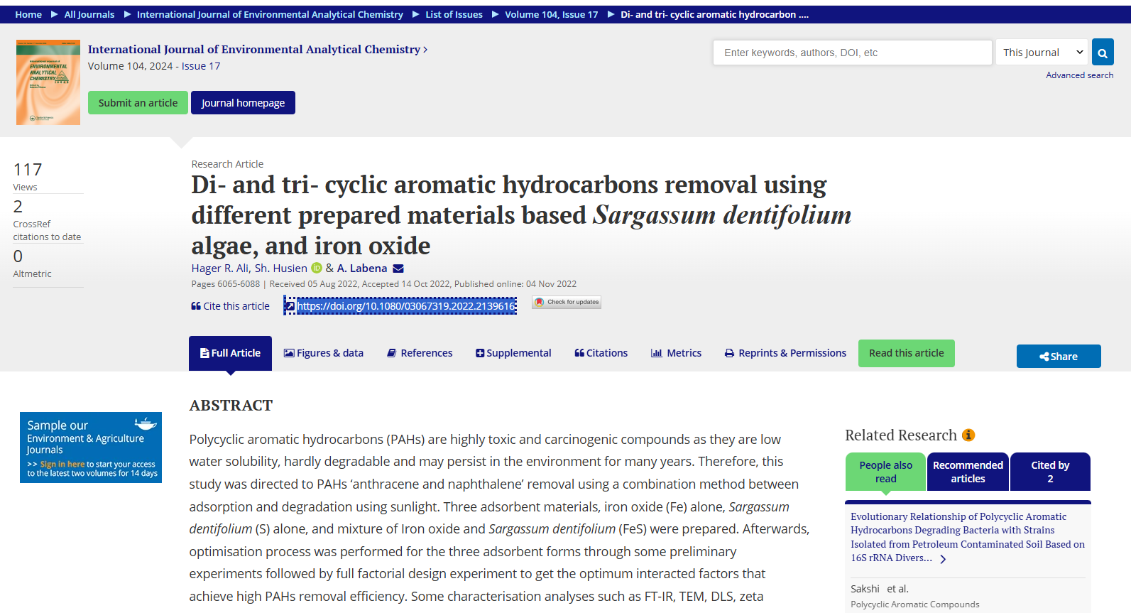 Di- and tri- cyclic aromatic hydrocarbons removal using different prepared materials based Sargassum dentifolium algae, and iron oxide
